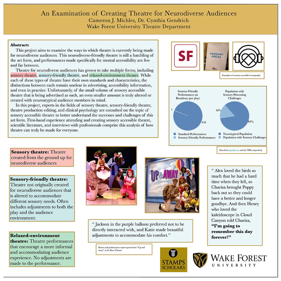 This research investigates the new and growing art of creating theatre for neurodiverse audiences. Through years of research with the Wake Forest University theatre and neuroscience departments, this project examines the creation of sensory theatre first through a case study in directing Up & Away by the Trusty Sidekick Theatre Company and then by a broader exploration of sensory-accessible theatre in many forms.